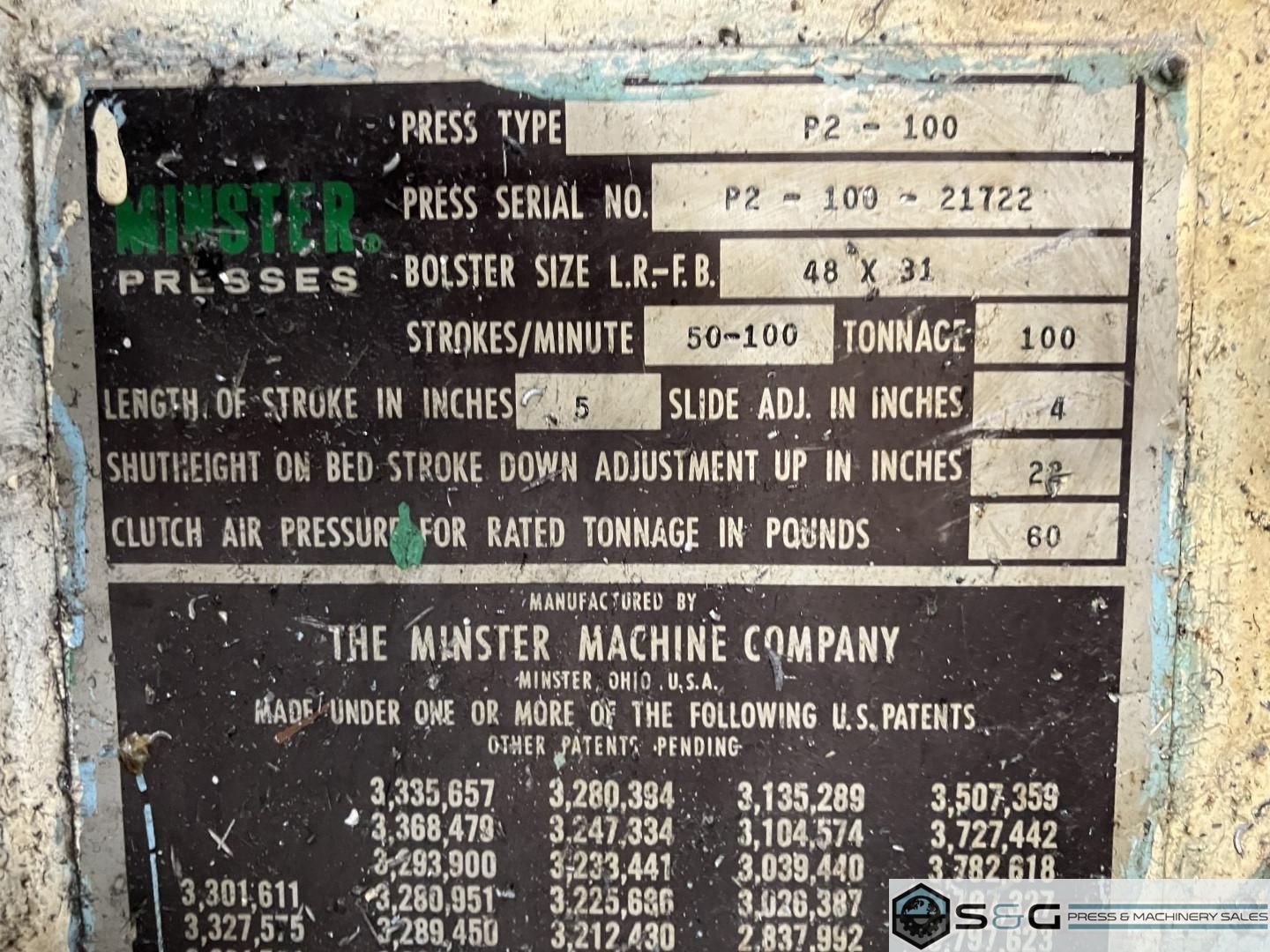 | Straight Side Double Crank Press, Used Minster Press, Minster High Speed Press For Sale, Minster Mechanical Press, Minster Press For Sale, P2-100-48 Minster Piece-Maker Press, Used 100 ton Minster Press For Sale, Used Minster Press For Sale, Used Mechanical Metal Stamping Press | ||