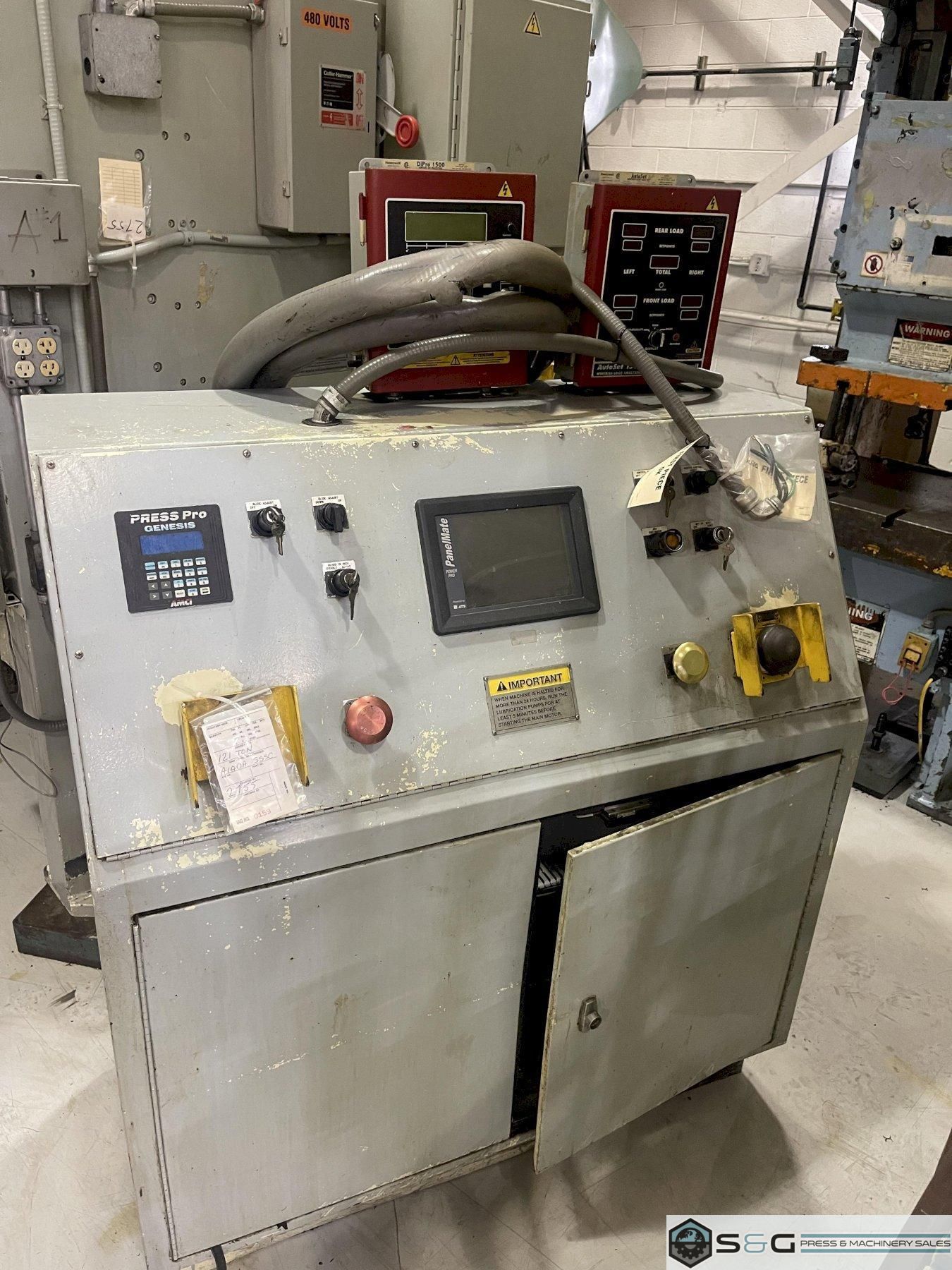 This high-precision 110-ton Aida NS1-1100 single point eccentric geared press offers a robust solution for high-speed metal forming and progressive die applications. Delivering a 121-ton (US) capacity, this used Aida mechanical press features a 4.33" stroke, variable speeds from 50–100 VSPM, and a 39.4" x 20.5" bed area. Engineered for safety and accuracy, it is equipped with an Aida wet clutch, Wintriss Die Pro 1500 controls, and Shadow V light curtains. This floor-standing unit includes hydraulic overloads and a Wintriss Autoset 1504 load analyzer for real-time monitoring. Increase your stamping efficiency with this reliable, 15 HP industrial press—available for immediate inspection in a professional production environment.