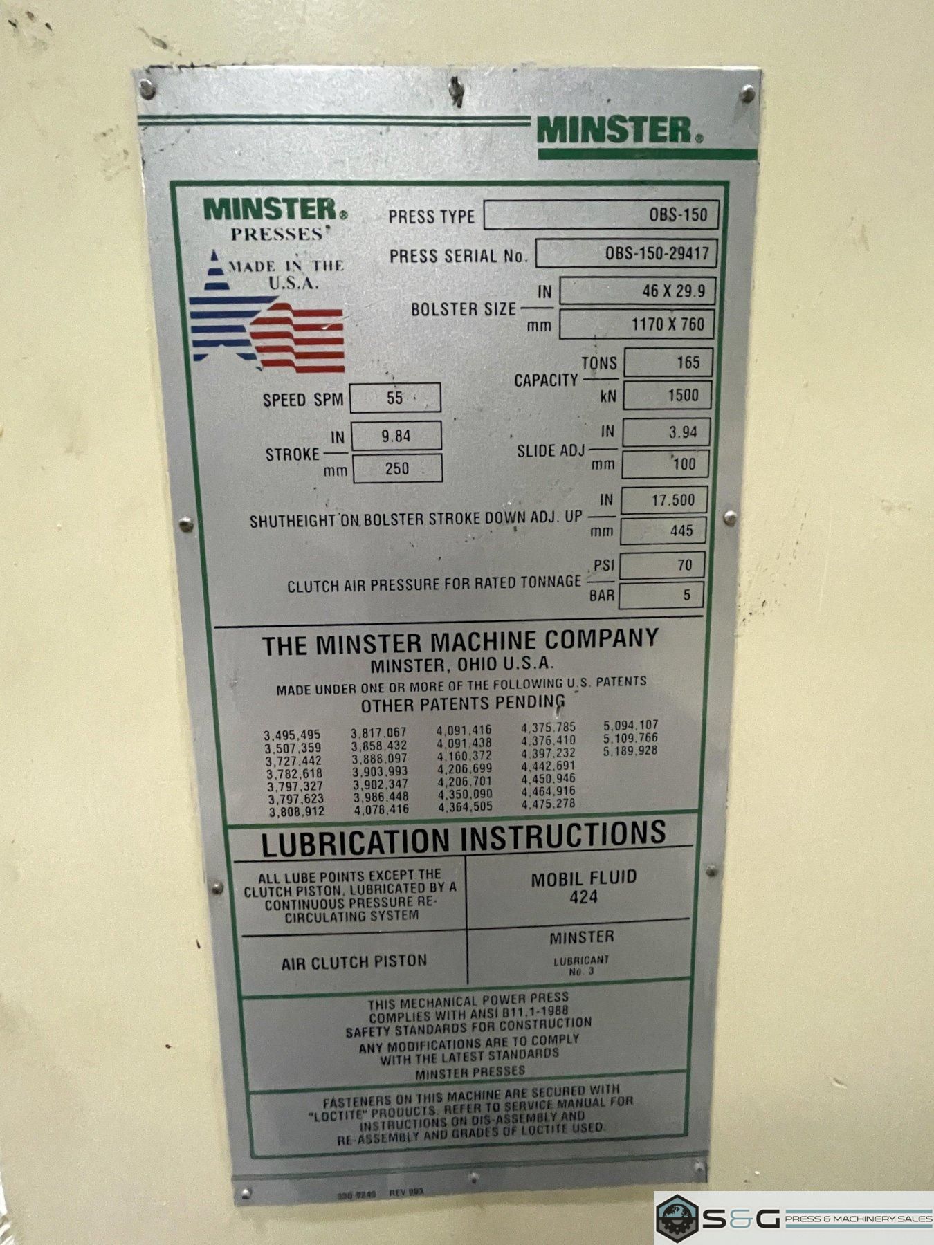 This Used 150 ton Minster OBS Press Can Be Seen Under Power In the S & G Press Livonia Michigan Warehouse