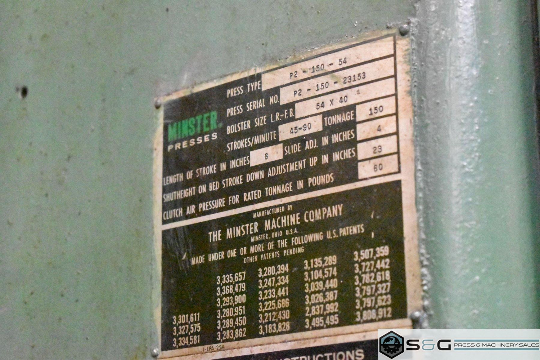 This 150-ton Minster Piece-Maker Stamping Press Can be seen underpower in the S&G Press Livonia Warehouse!