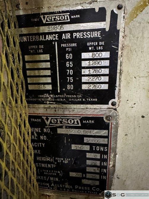 | 150 ton Mechanical Press For Sale, Used 150 ton Press, 150 ton Press For Sale, 150 ton Stamping Press, 150-ton Verson OBG Press, Used Mechanical Metal Stamping Press, Metal Stamping Press For Sale | ||