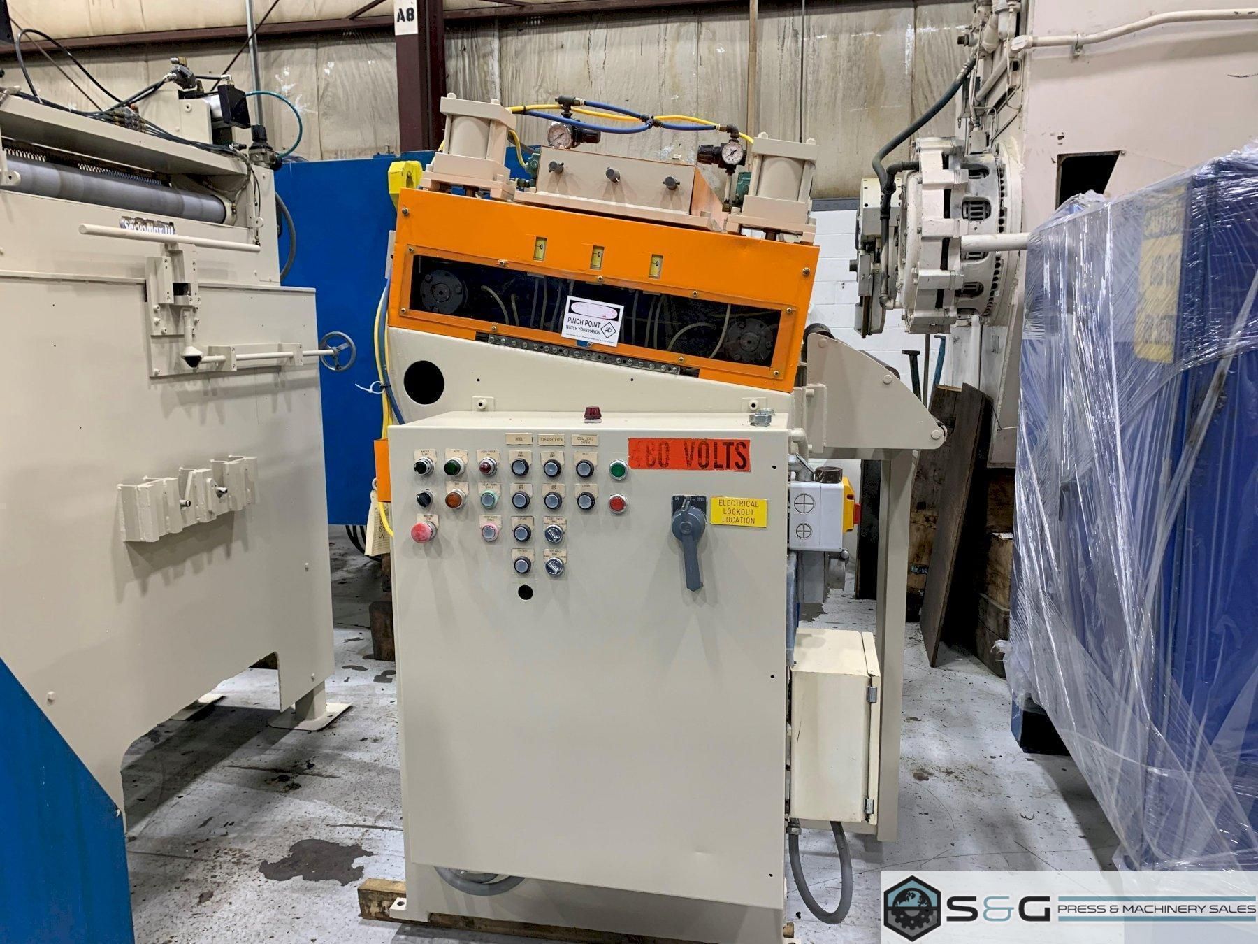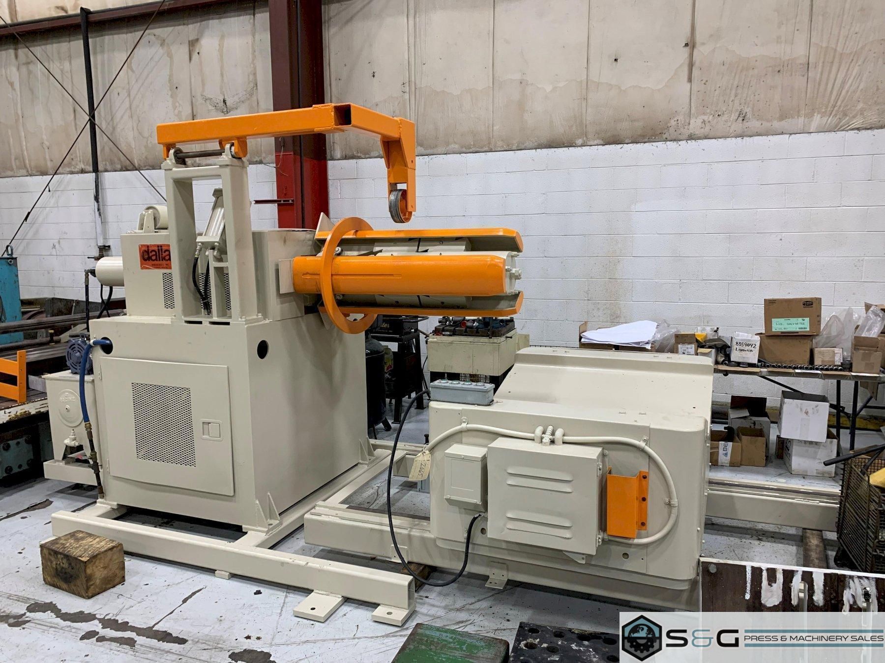 This Used Dallas Coil Reel and Powered Straightener can be seen under power in the S & G Press Livonia Mi Warehouse!