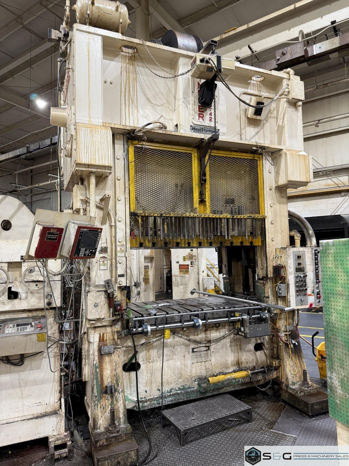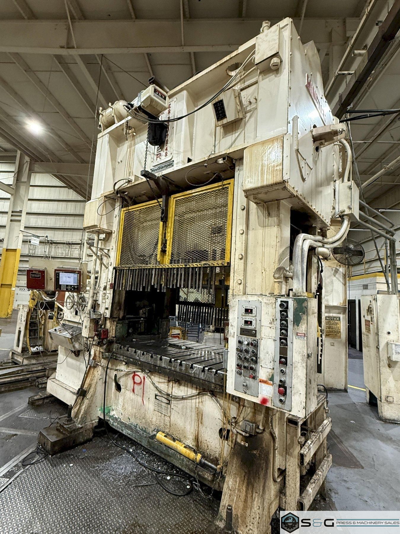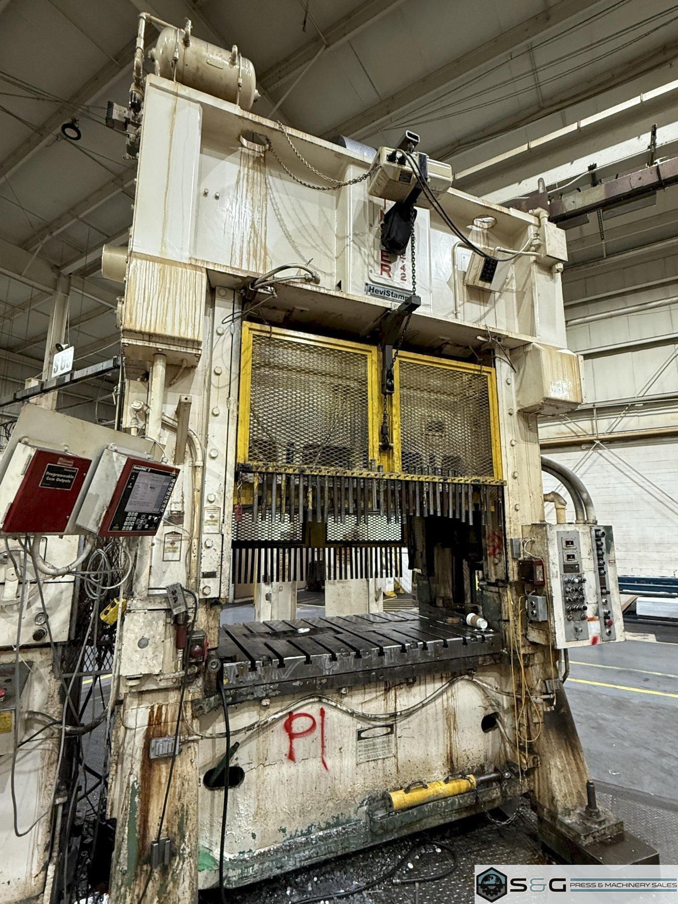 Used 200-ton Minster Straight Side Mechanical Press This used 200-ton Minster Hevi-Stamper Model E2-200-72-42 is a high-performance straight-side mechanical stamping press engineered for demanding progressive and transfer die applications. Known for its robust construction, this 200-ton Minster press delivers the precision required for high-volume metalworking.With a highly desirable 10" stroke and a variable speed range of 30–60 VSPM, this eccentric shaft press features a 72" x 42" bed area and 8-point brass-lined gibs for maximum stability. Key technical features include an air clutch and brake, Minster Monitor Flow lubrication, and air counterbalances.