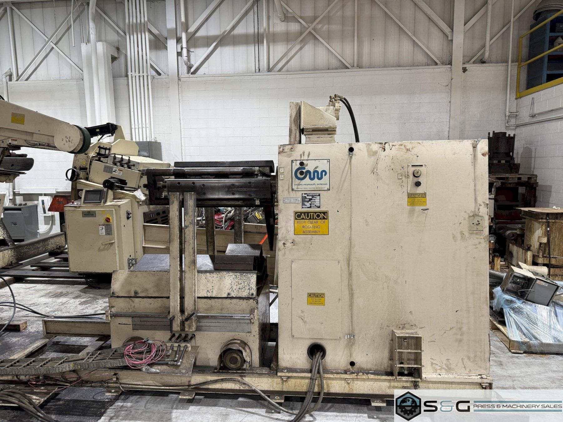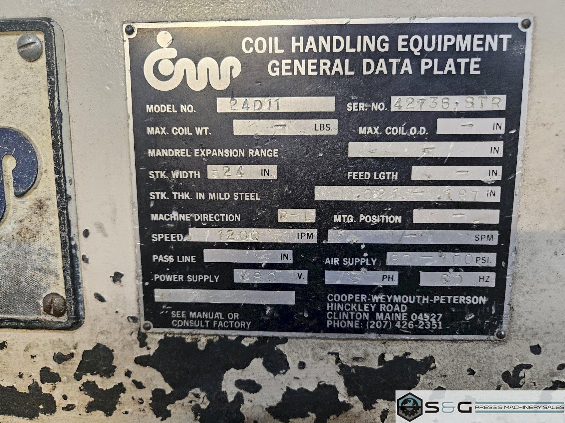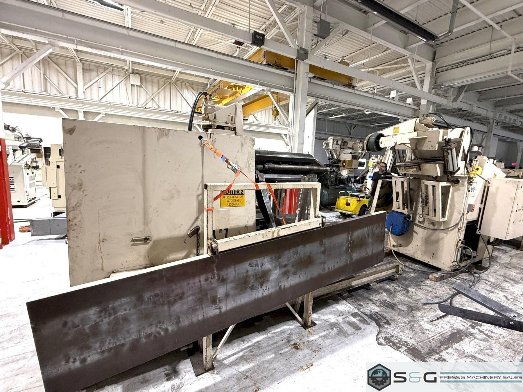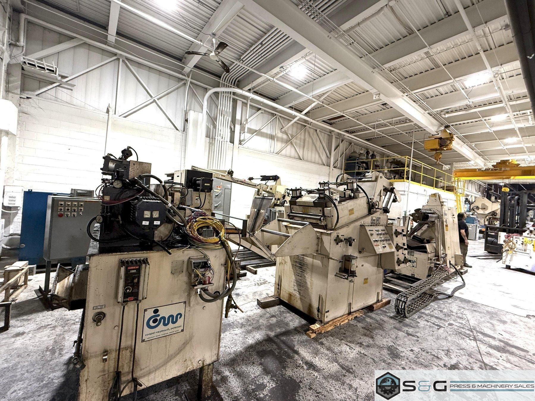 Cooper-Weymouth-Peterson Heavy Duty Coil Feed LineStandard Specifications 20,000 lbs. Coil Capacity 24" Maximum Coil Width .187" x 24" Maximum Coil Thickness 60" Maximum Coil O.D. 15.5" - 20.5" Mandrel Expansion Range Right To Left Feed Direction CWP Coil Reel Model 6R-24 with Coil Car Model 20042 CLC 24" Cooper-Weymouth-Peterson Heavy Duty Coil Handling Equipment for SaleLooking for heavy-duty coil handling equipment? S&G Press has a robust used Cooper-Weymouth-Peterson coil feed line available, perfect for demanding metal stamping operations. This 24-inch coil line boasts a 20,000 lbs coil capacity and can process material up to .187" thick. Featuring a CWP Coil Reel (Model 6R-24) with a traveling coil car, a CWP Powered Coil Straightener (Model 24D11) with eleven straightening rolls, and a CWP Coil Servo Roll Feed (Model SMX24H Heavy Duty), this system offers precision and efficiency. The servo roll feed includes 500 job storage and AC servo drive and controls for seamless integration. This Cooper-Weymouth-Peterson equipment is designed for high-volume production and can be seen under power at the S&G Press Warehouse. Upgrade your coil processing capabilities today! |