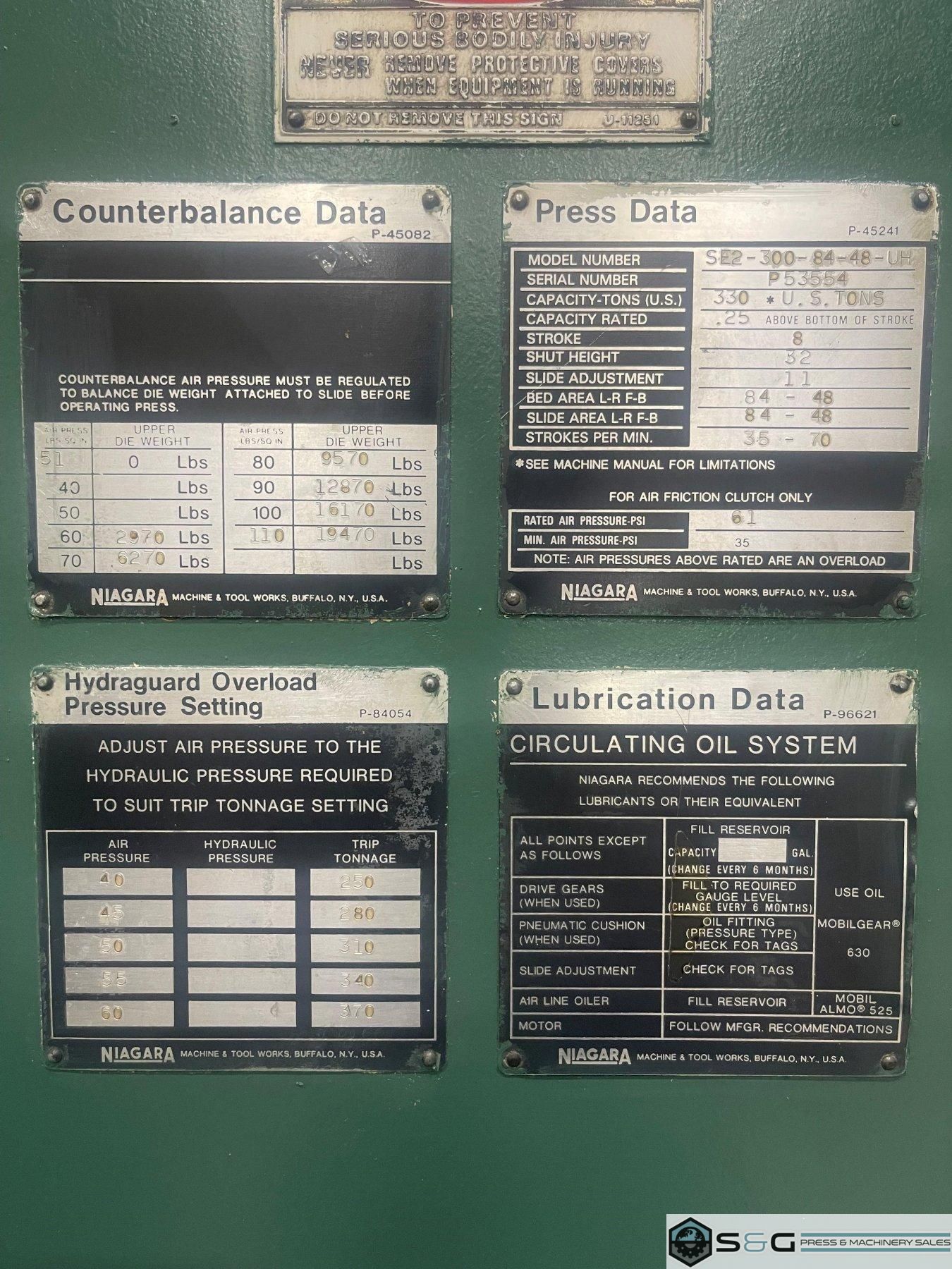 Standard Specification 300 ton Press For sale: this used 300-ton Clearing Niagara SE2-300-84-48UH Straight Side Mechanical Metal Stamping Press. |