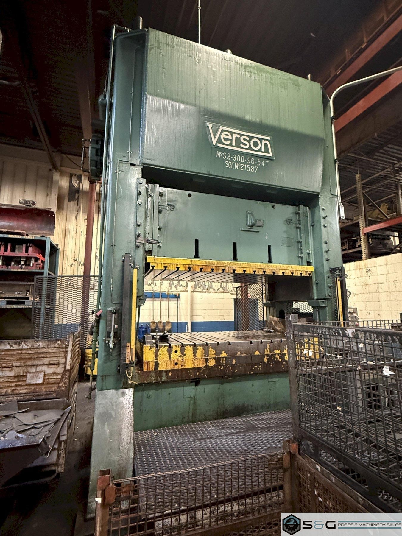 Verson Straight Side Double CrankMechanical Metal Stamping Press300-ton Model S2-300-96-54T300-ton Capacity12" Stroke 52" Shut Height On Bed 45" Shut Height Over Bolster 6" Motorized Adjustment 96" LR x 54" FB Bed Area 96" LR x 54" FB Slide Area 25 SPM Equipment and Features Air Clutch and Brake Air Counterbalances Lubrication System 7" Thick T-Slotted Bolster Knockouts in Ram T-Slotted Ram Plate 50 H.P. Main Motor Single / Inch Operations 38" Wide Windows Floor Standing Total Weight: 101,000 lbs. This 300-ton Verson Straight Side Press can be seen underpower in operation! Maximize your stamping capabilities with this heavy-duty 300-ton Verson S2-300-96-54T, a robust straight side double crank mechanical press. Engineered for high-precision metal stamping, this 101,000 lbs. workhorse features a massive 96" x 54" bed area, 12" stroke, and a 50 H.P. main motor. Equipped with 38" wide windows, air counterbalances, and a 7" thick T-slotted bolster, this floor-standing used Verson press is ideal for demanding industrial applications. Experience unmatched rigidity and reliability—available for immediate inspection under power in a professional production environment |