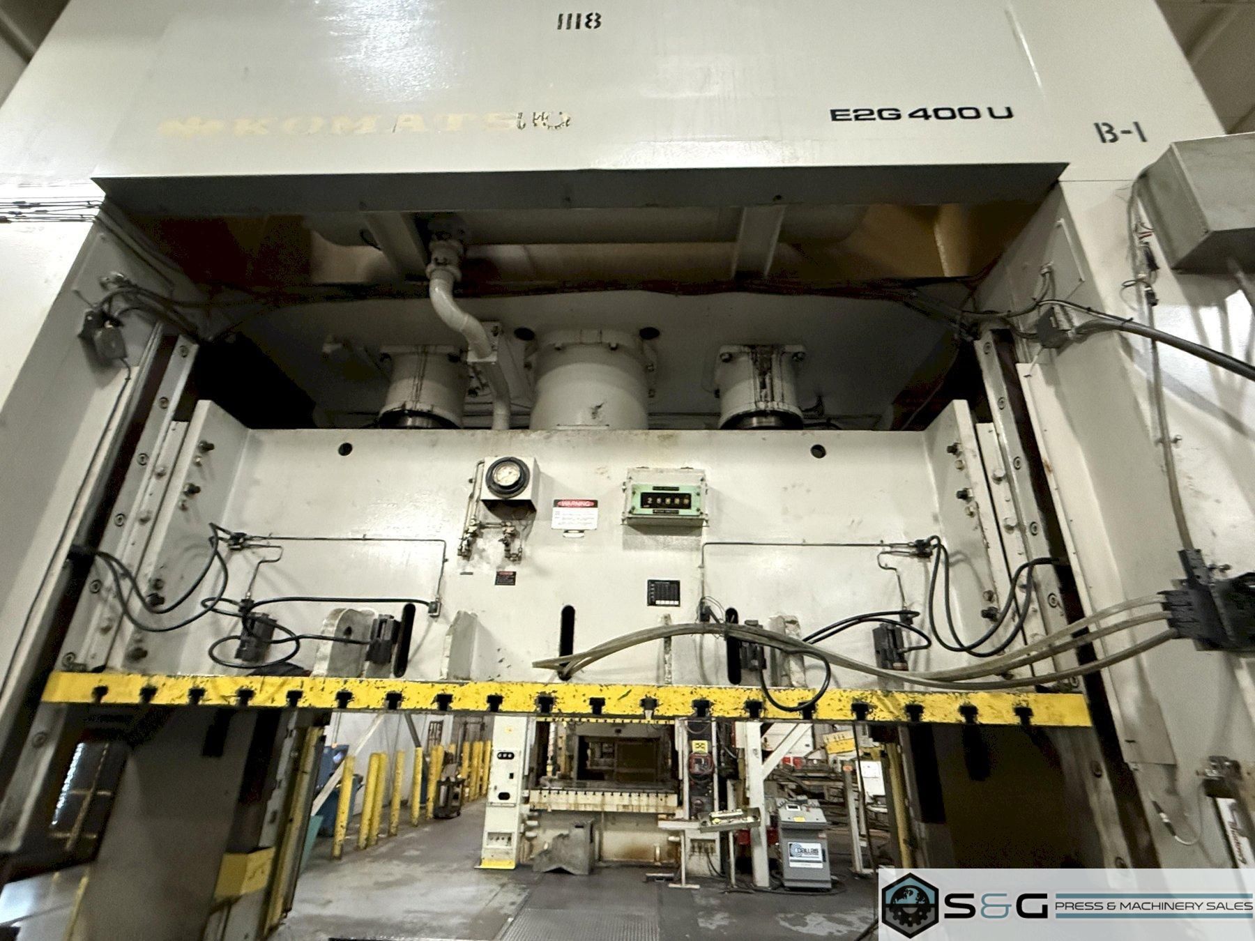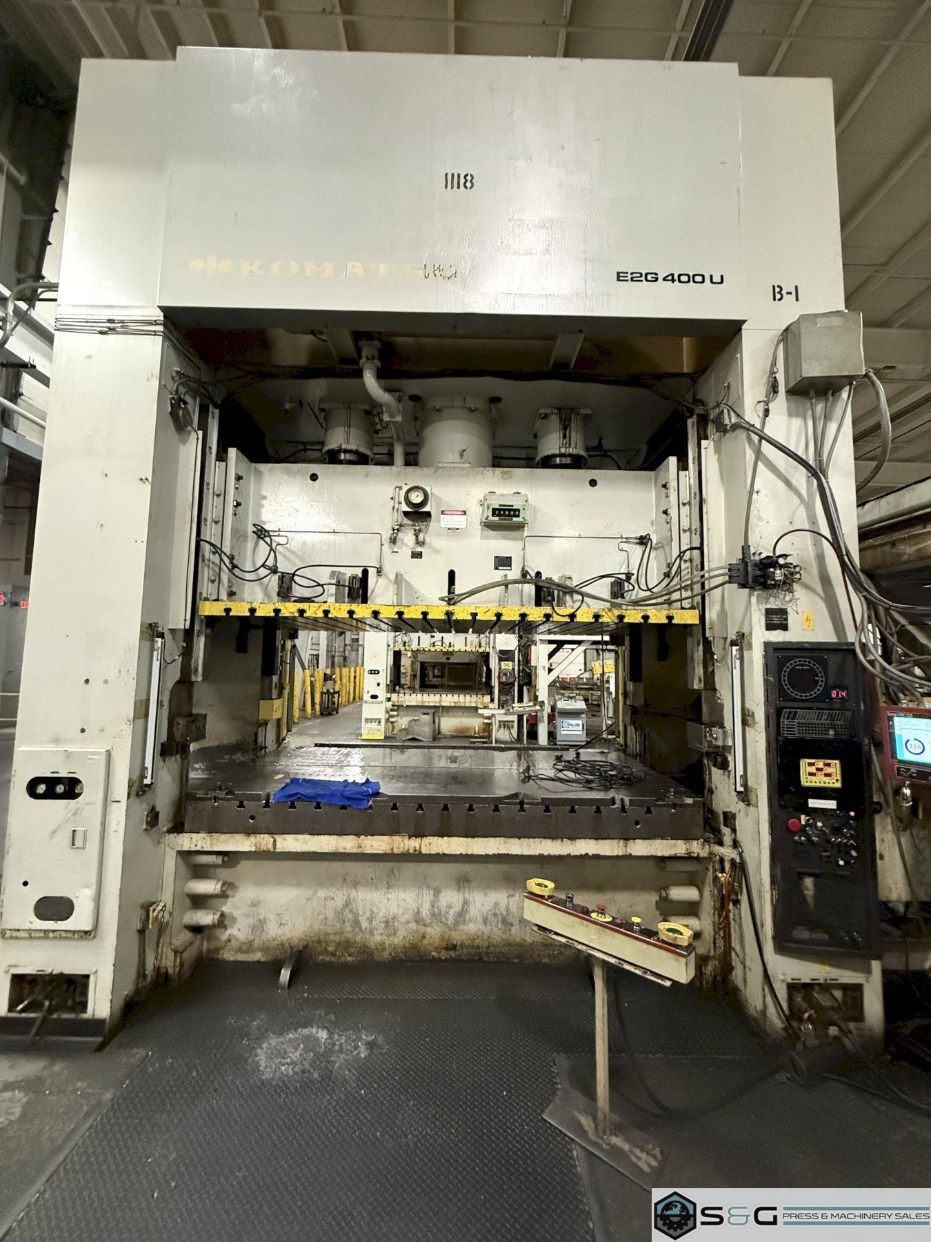400-ton Komatsu Model# E2G-400 Optimize your production capacity with this 400-ton Komatsu E2G-400 Straight Side Mechanical Stamping Press. This 1990 floor-standing press offers a massive 122" x 61" bed and slide area, a 16.1" stroke, and a variable speed of 20-40 VSPM. Engineered for precision and heavy-duty output, it features a 75 HP main motor, 8-point gibbing, and a Wintriss Smart Pak Pro controller with 8-input die protection. This used Komatsu press is fully equipped with hydraulic overloads, Vibro Dynamic isolation pads, and 42" wide windows, making it a turnkey solution for high-capacity metalforming and stamping operations. Why Buy This Komatsu 400-Ton From S&G Press?Purchasing a 400-ton machine is a significant investment. At S&G Press, we remove the guesswork from the process by offering unique advantages that most equipment brokers can't match: