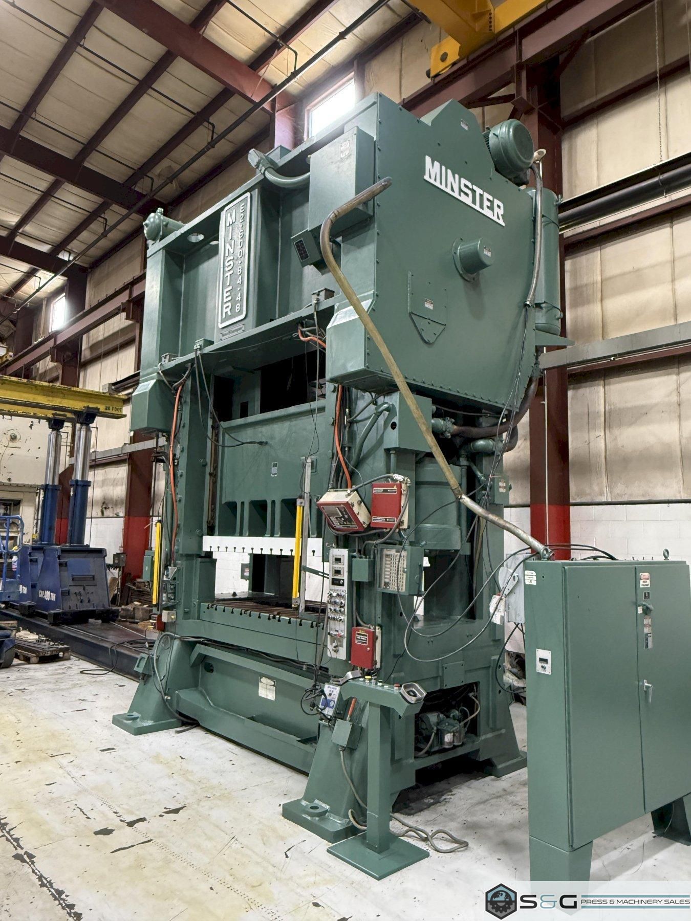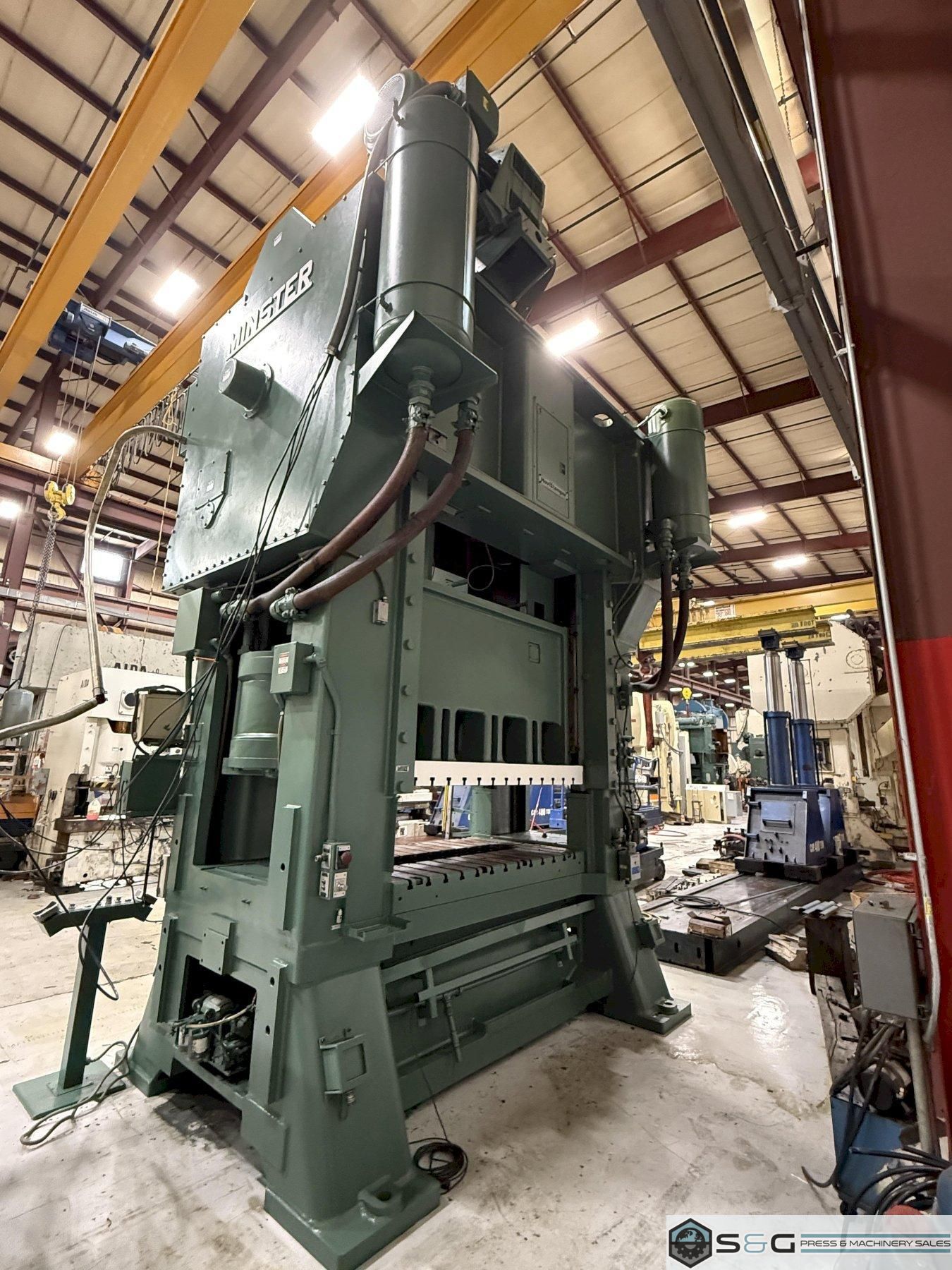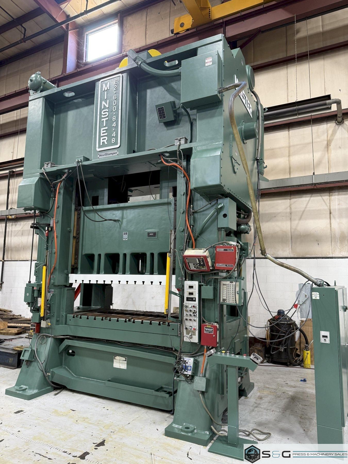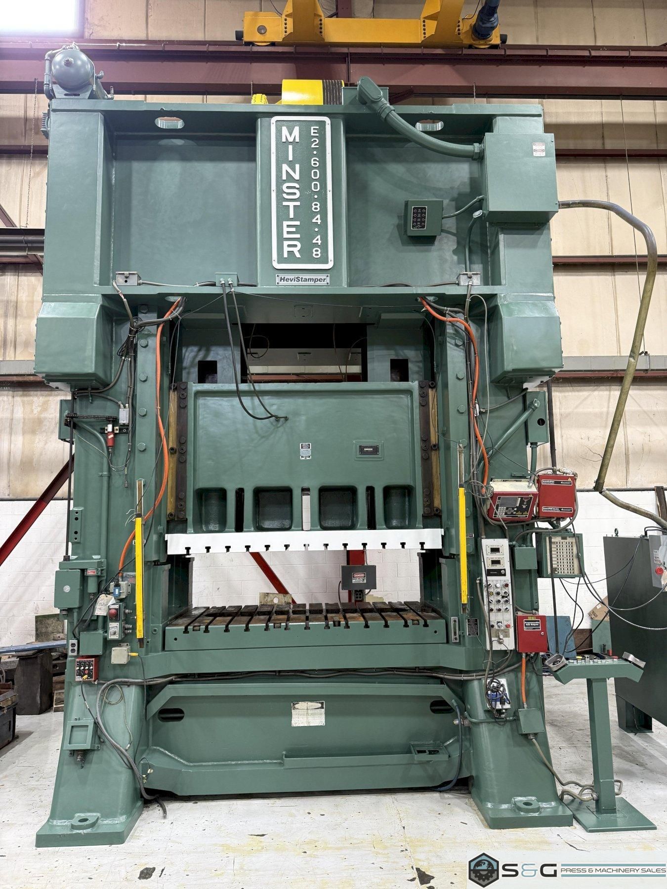 Shipping Dimensions and Weight 20' 4.5" Tall x 94" Front to Back x 162.6" Width 165,000 lbs. Approx. Weight of Press Fully Assembled The 600-ton Minster E2-600-84-48 Hevi-stamper Press is widely considered the industry's best for heavy-duty stamping operations. Its robust frame, exceptional reliability, and high tonnage capacity make it ideal for forming large and complex metal components, used extensively in automotive, aerospace, and other demanding manufacturing sectors. This 600-ton Minster Hevi-Stamper Mechanical Metal Stamping Press can be seen under power in the S&G Press Livonia Michigan Warehouse! Click here for more used Minster Presses. Why buy a Used Minster Hevi-Stamper Press from S&G Press? Minster Hevi-Stamper presses have earned a strong reputation for their exceptional quality and performance within the metal stamping industry. Several factors contribute to their esteemed status: