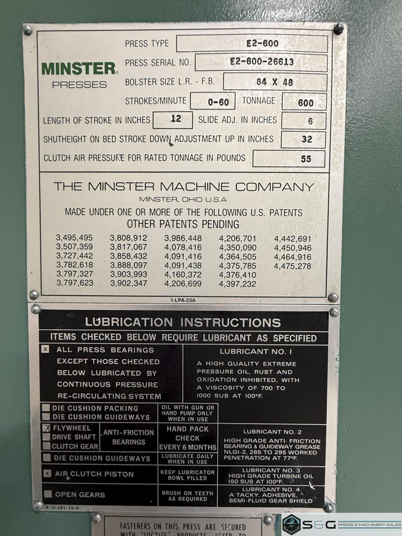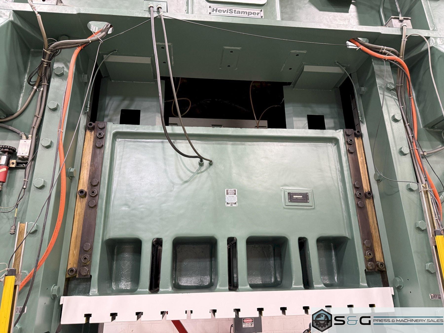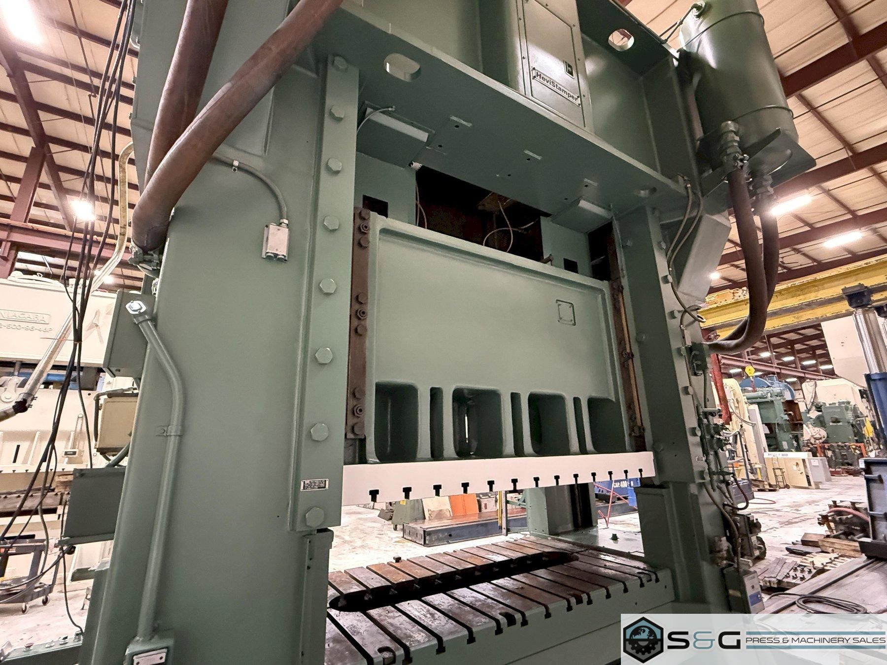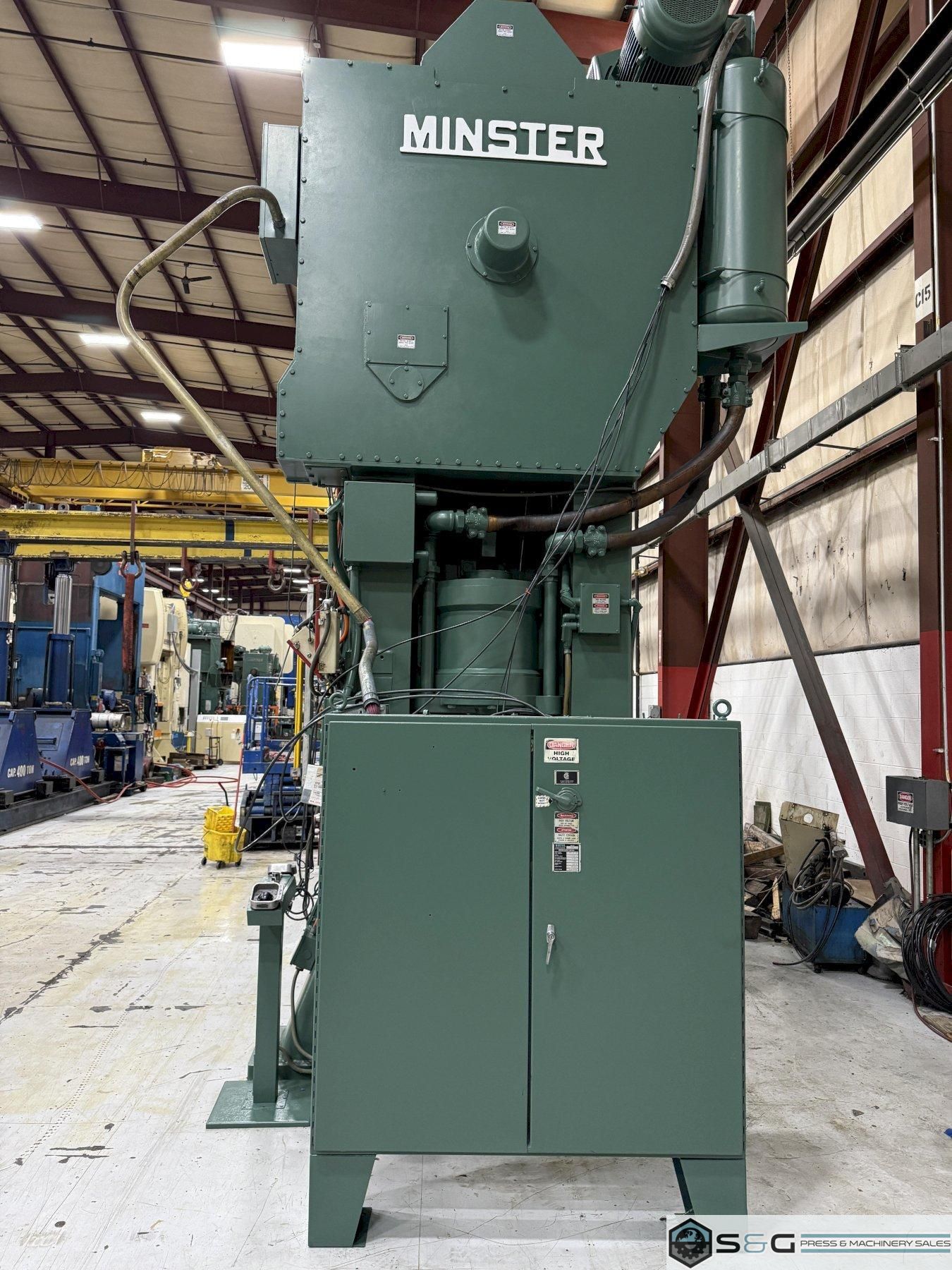 Shipping Dimensions and Weight 20' 4.5" Tall x 94" Front to Back x 162.6" Width 165,000 lbs. Approx. Weight of Press Fully Assembled The 600-ton Minster E2-600-84-48 Hevi-stamper Press is widely considered the industry's best for heavy-duty stamping operations. Its robust frame, exceptional reliability, and high tonnage capacity make it ideal for forming large and complex metal components, used extensively in automotive, aerospace, and other demanding manufacturing sectors. This 600-ton Minster Hevi-Stamper Mechanical Metal Stamping Press can be seen under power in the S&G Press Livonia Michigan Warehouse! Click here for more used Minster Presses. Why buy a Used Minster Hevi-Stamper Press from S&G Press? Minster Hevi-Stamper presses have earned a strong reputation for their exceptional quality and performance within the metal stamping industry. Several factors contribute to their esteemed status: