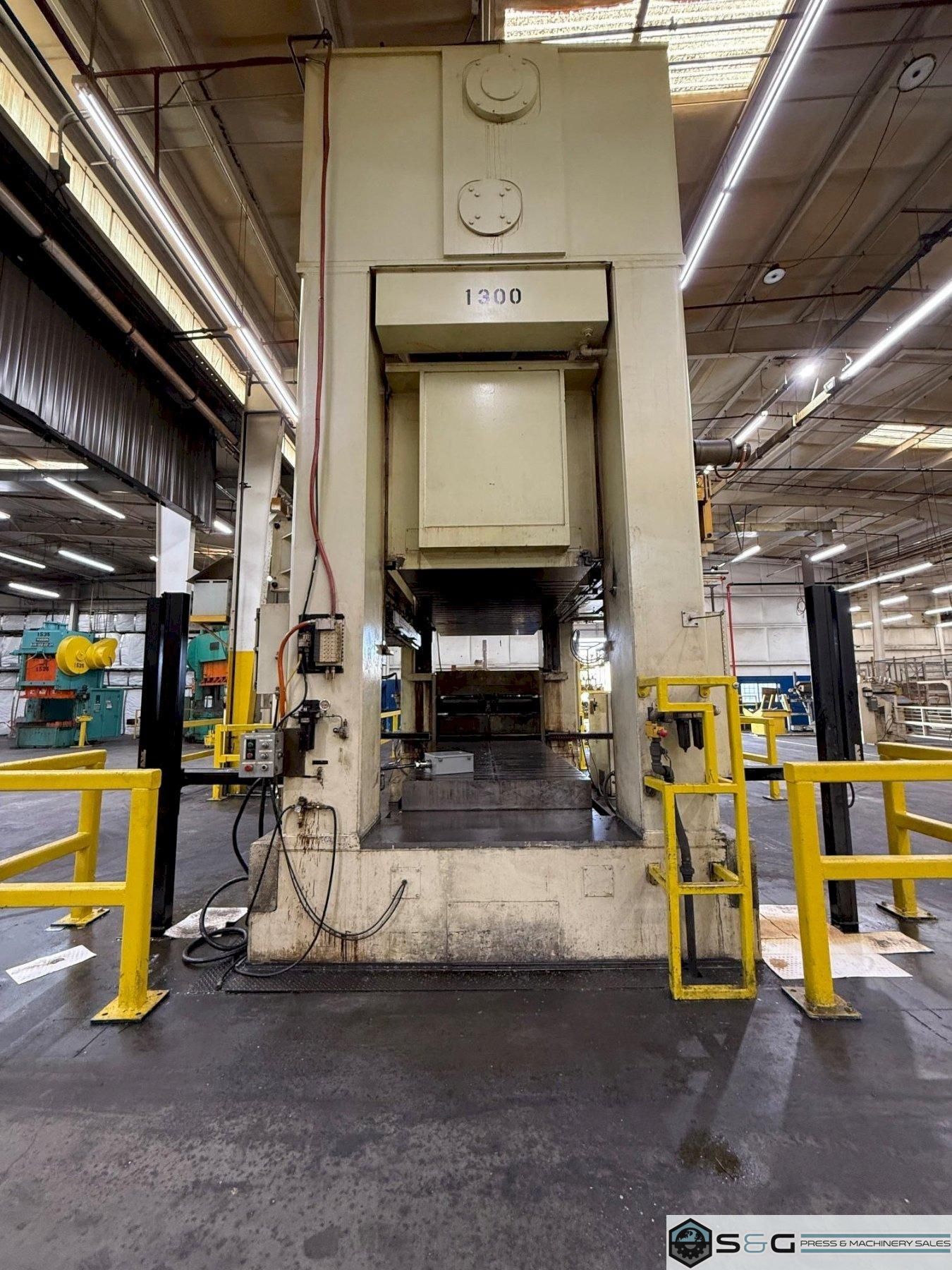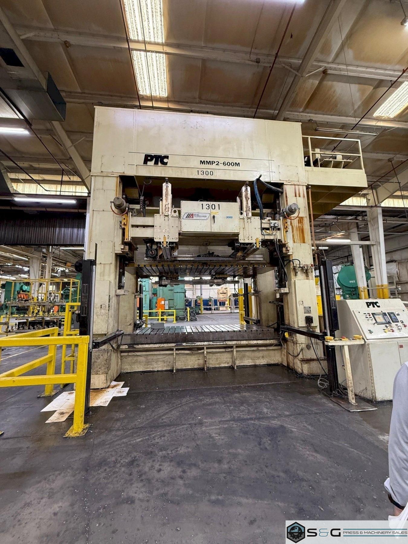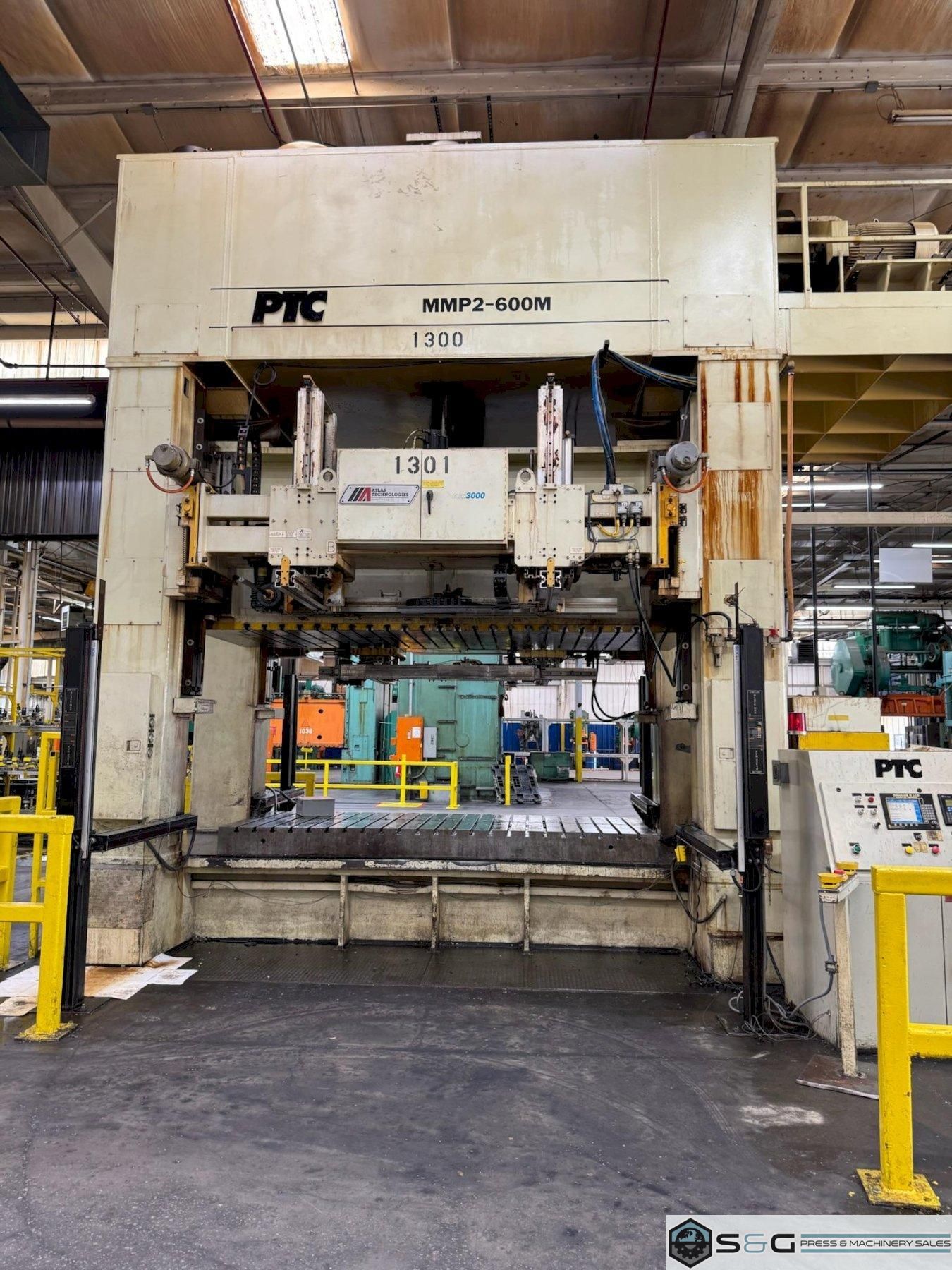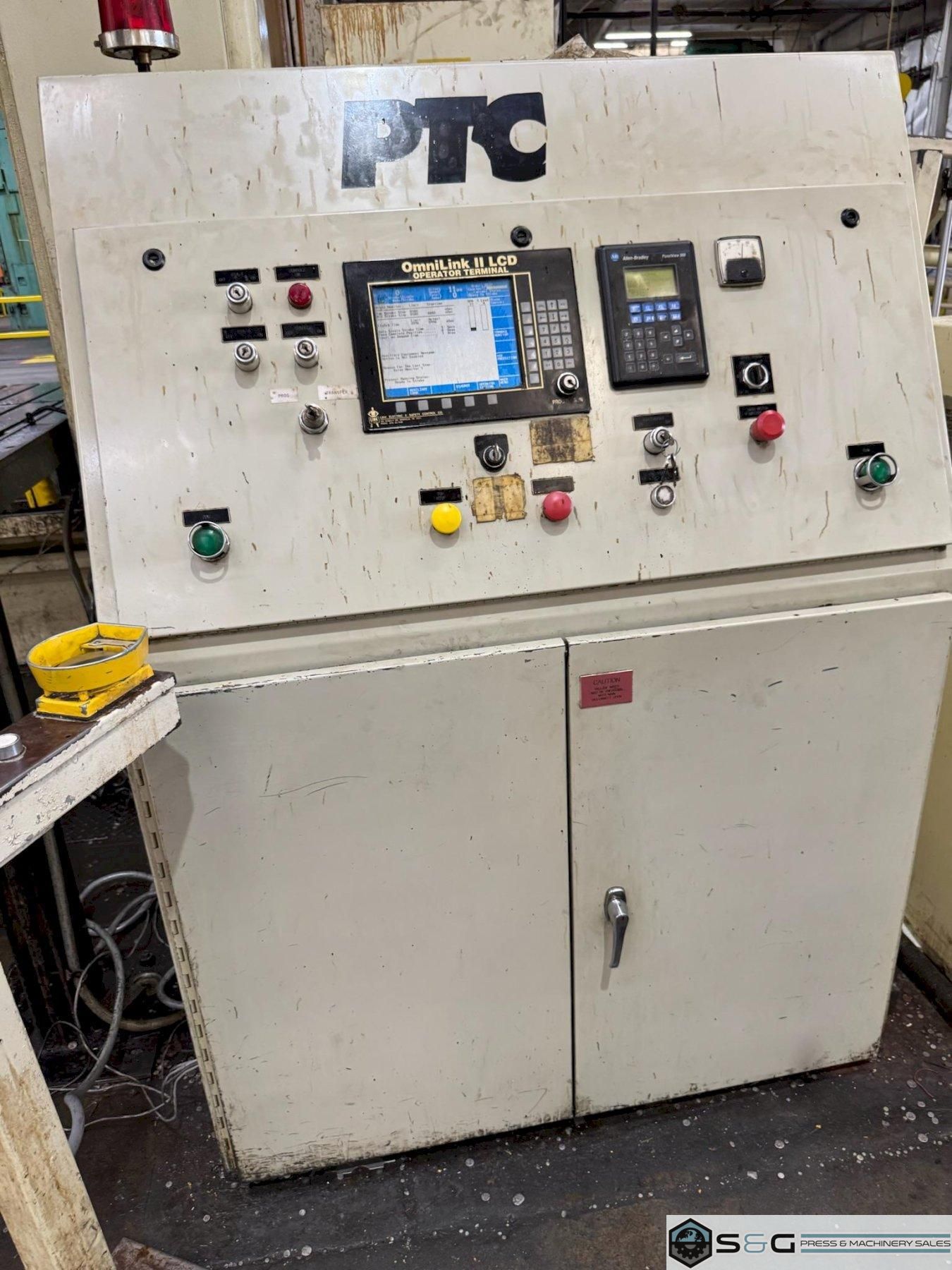 A PTC 660-ton mechanical transfer press, such as the Model MMP2-600M, is an industrial machine used for high-volume metal stamping and forming. These presses are known for their speed and precision, using a series of dies to perform multiple operations on a single part in one continuous cycle. With a 660-ton capacity, they are capable of handling heavy-duty applications. The "transfer" feature automates the movement of the workpiece between stations, increasing efficiency and reducing labor costs.  In addition to being efficient, the transfer feature ensures part consistency by minimizing manual handling and potential errors. This type of press is commonly used in the automotive and appliance industries to produce complex parts like vehicle body panels or washing machine tubs. The advanced control systems on modern presses allow for precise management of speed, force, and timing.
