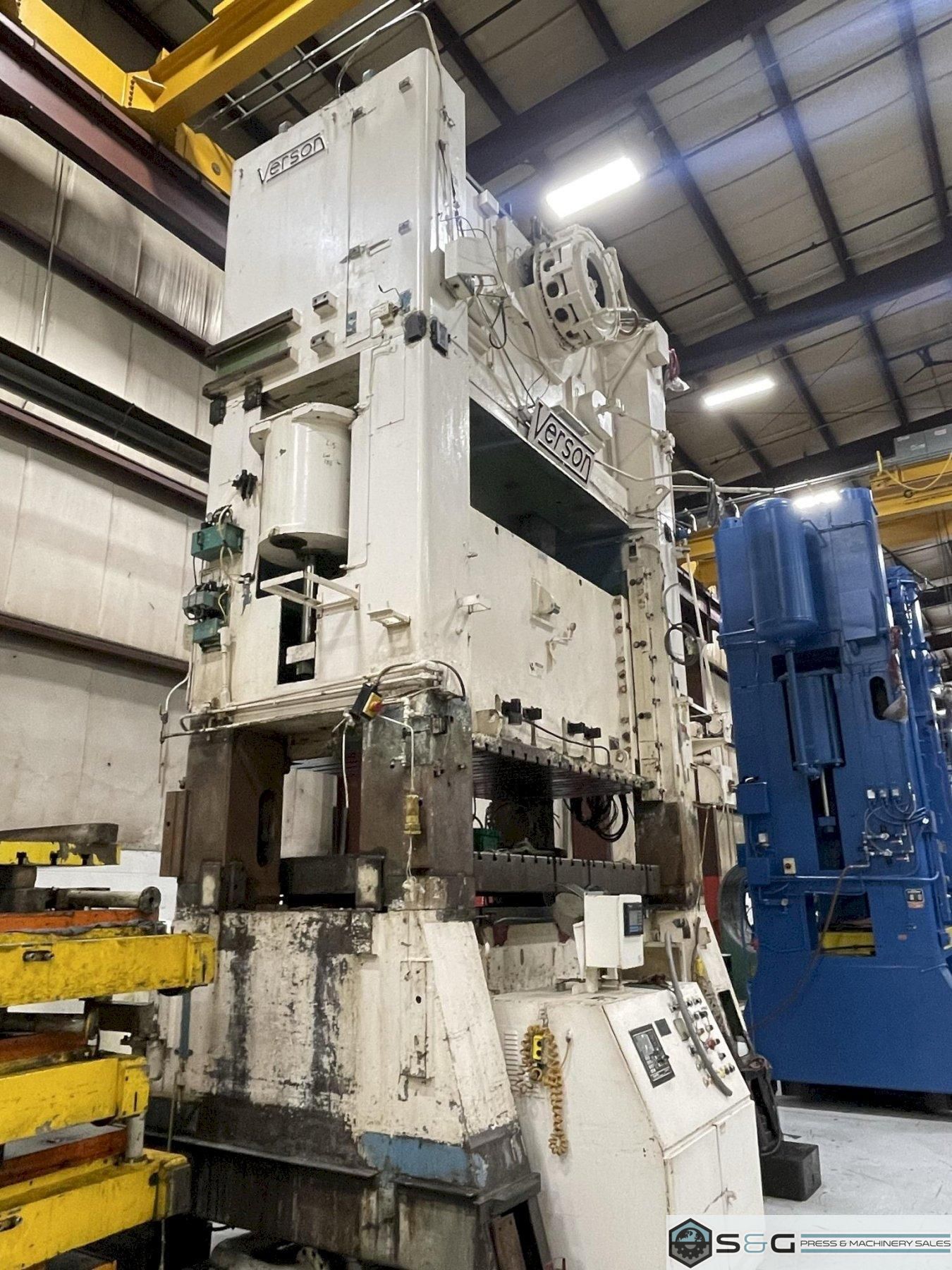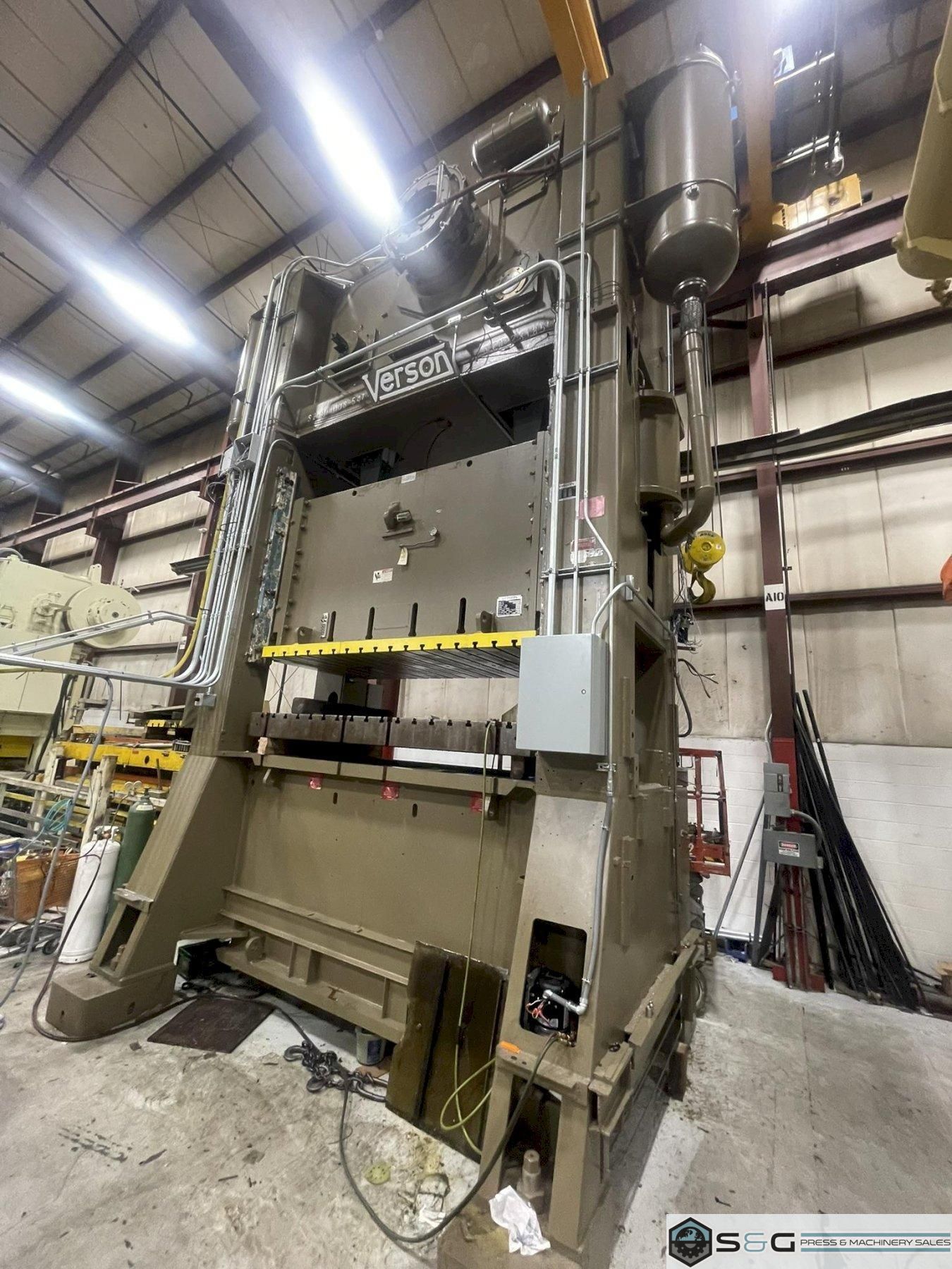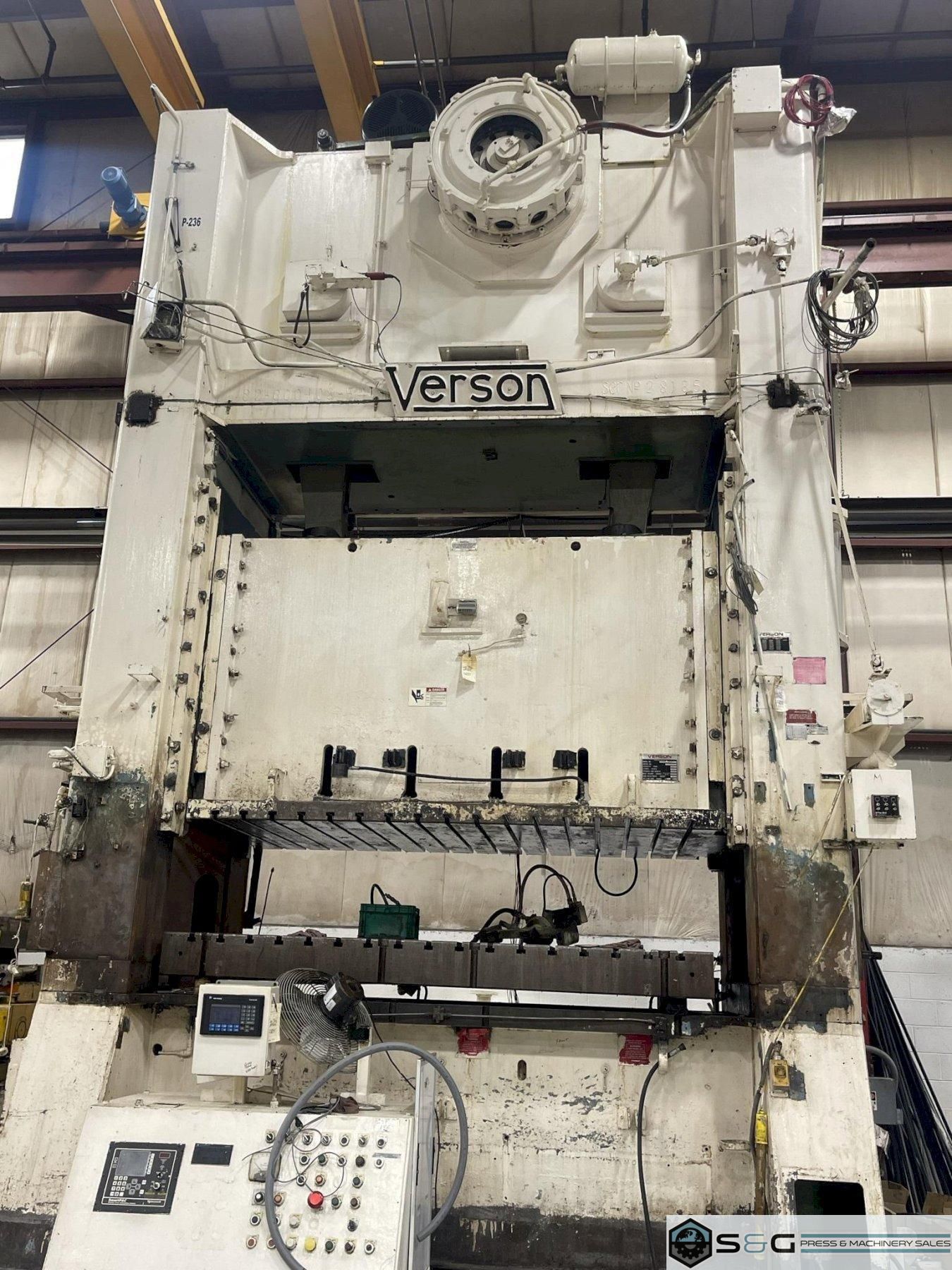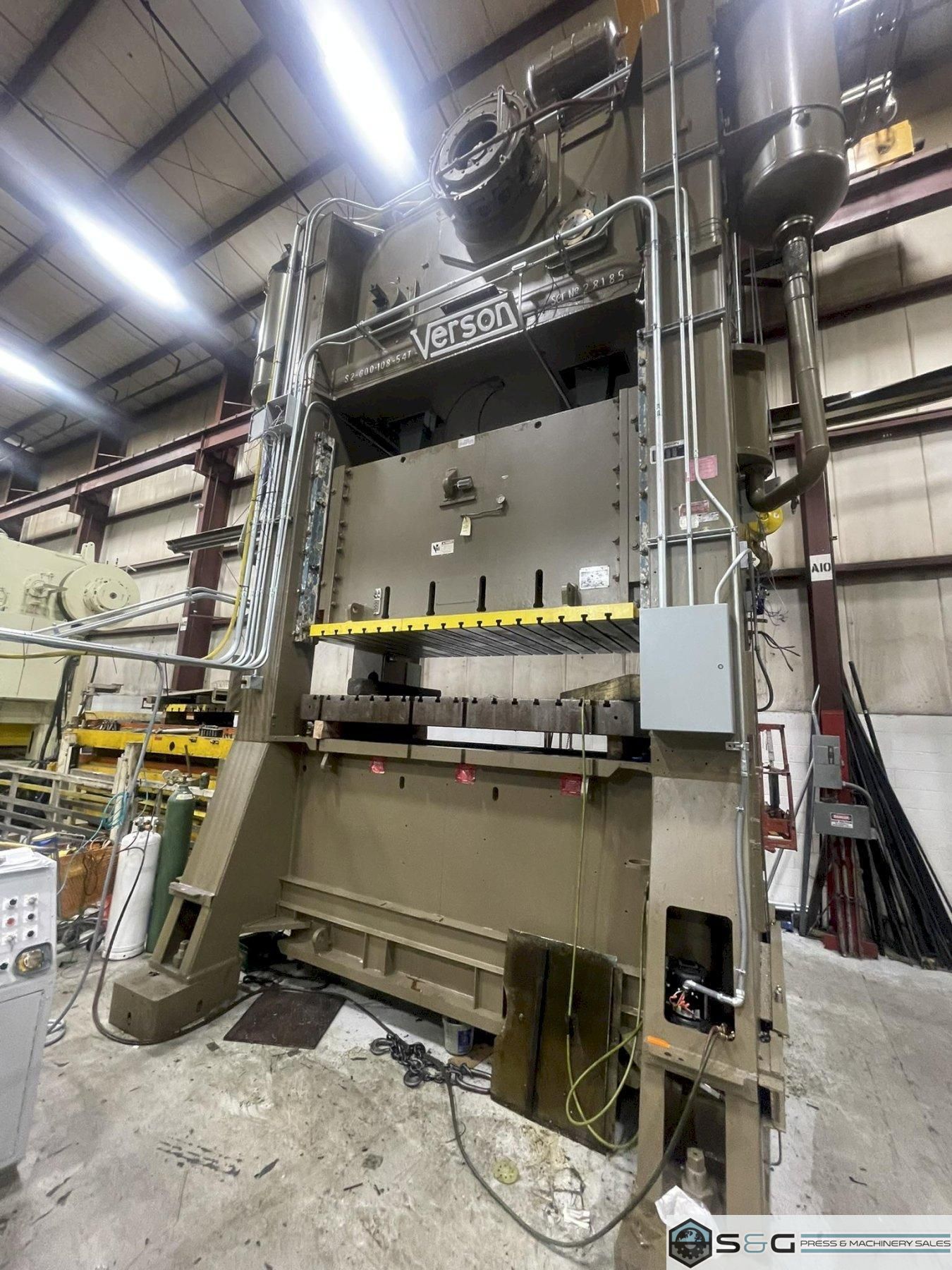 Used Verson Press Model# S2-600-108-54tStandard Specification Mechanical Metal Stamping Press 600 ton Capacity 12" Stroke 41.5" Shut Height on Bed 10" Motorized Adjustment 108" LR x 54" FB Bed Area 108" LR x 54" FB Slide Area 30-60 Variable Strokes Per Minute Equipment and Features Air Clutch and Brake Air Counterbalances Recirculating Lube System T-Slotted Ram and Bolster 8.5" Bolster Plate Thickness Shut Height Indicator Wintriss Smart Pak Press Controls Free Standing Console 38" Wide Windows 150 HP Main Drive Motor Light Curtains Hydraulic Tie Rod Nuts Floor Standing Press Weight: 168,200 lbs. For complete scope of recondition work contact your sales professional. This used 600 ton Verson Mechanical Metal Stamping Press an be inspected upon request at the S&G Press Livonia Michigan Warehouse!