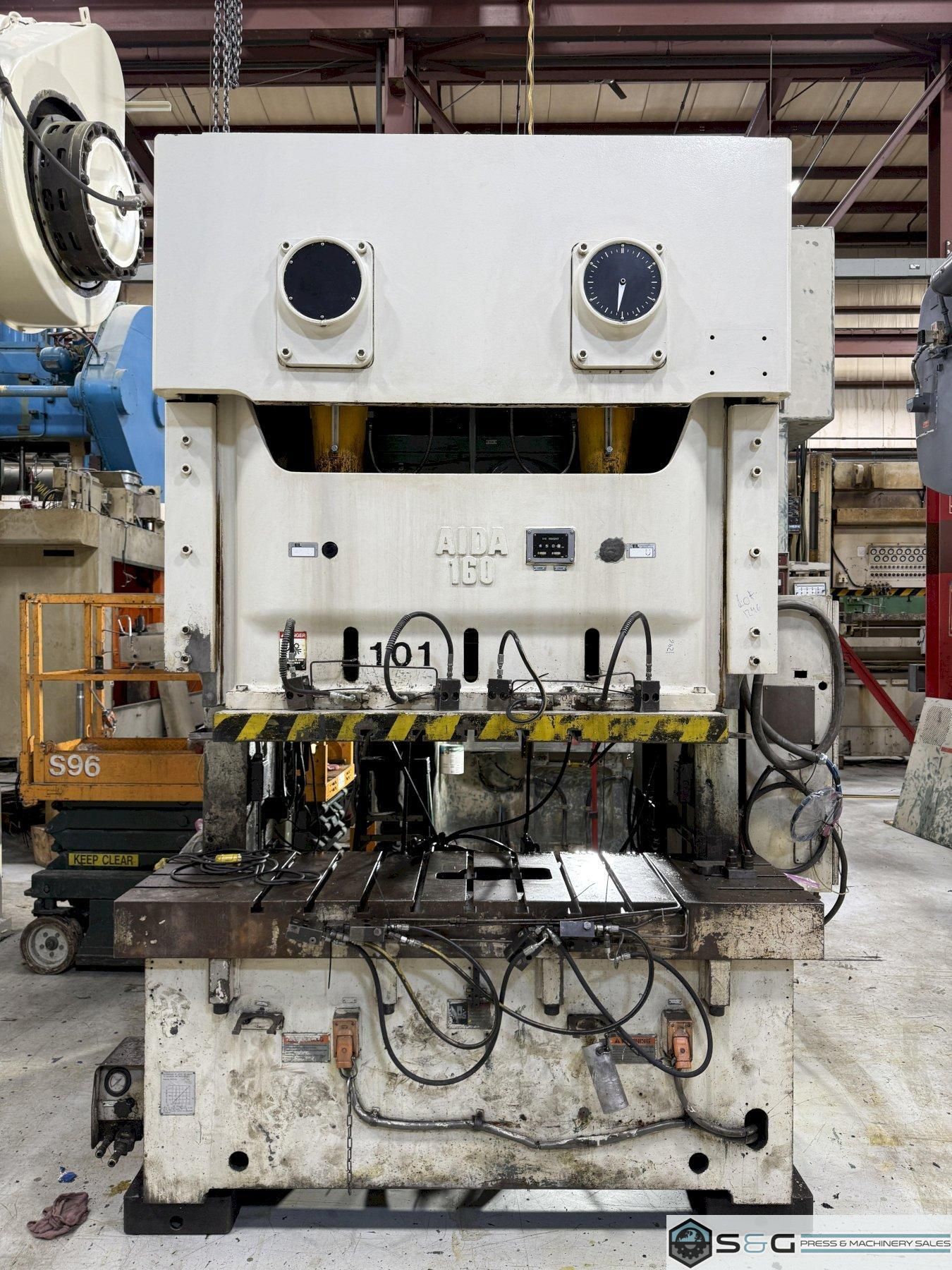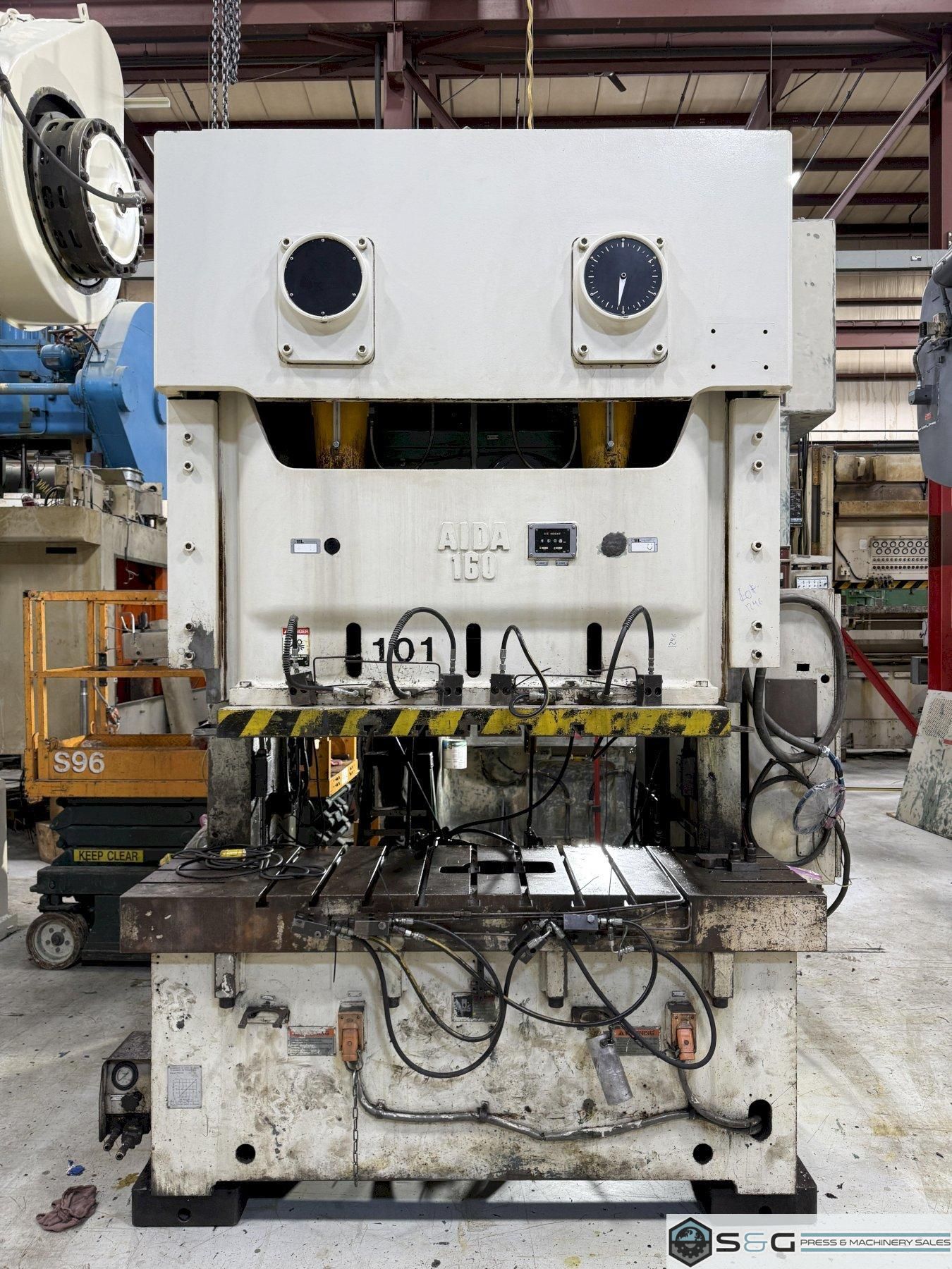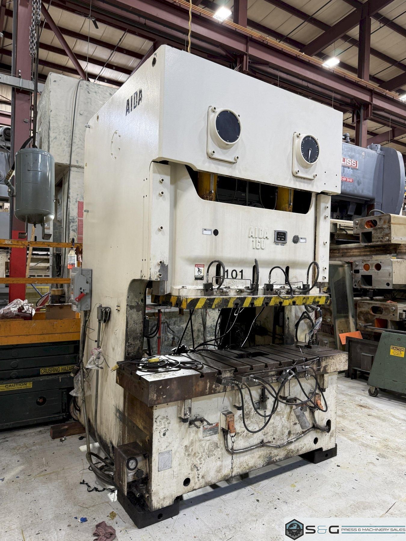 Used Metal Stamping 160 ton Aida Double Crank Gap Press can be inspected in the S&G Press Livonia Michigan Warehouse!! This used 160 ton Aida double crank gap mechanical metal stamping press for sale is a robust and reliable machine, model NC2-160-1. Known for its precision and durability, this Aida press is a cost-effective solution for a variety of metal stamping applications. The double crank gap press design offers stability and even distribution of force across the die area. This specific used Aida 160 ton press has been inspected and is ready to enhance your production capabilities. Contact us today for a detailed specification sheet and a competitive quote on this used Aida press for sale. |
